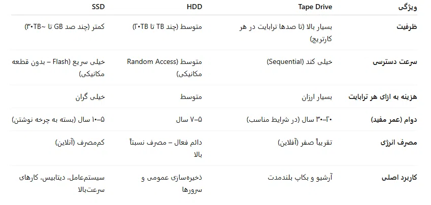سرعت دسترسی پایین: دسترسی به دادهها ترتیبی (Sequential) است، نه تصادفی مثل هارد دیسک یا SSD بنابراین بازیابی یک فایل خاص ممکن است زمانبر باشد.